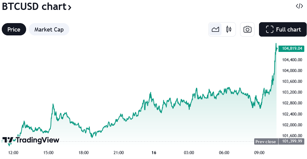 Menurut CoinDesk, nilai Bitcoin meningkat sebanyak 3.16% kepada AS$104,543.85, manakala Ether turut naik 2.36% kepada AS$3,953.16.